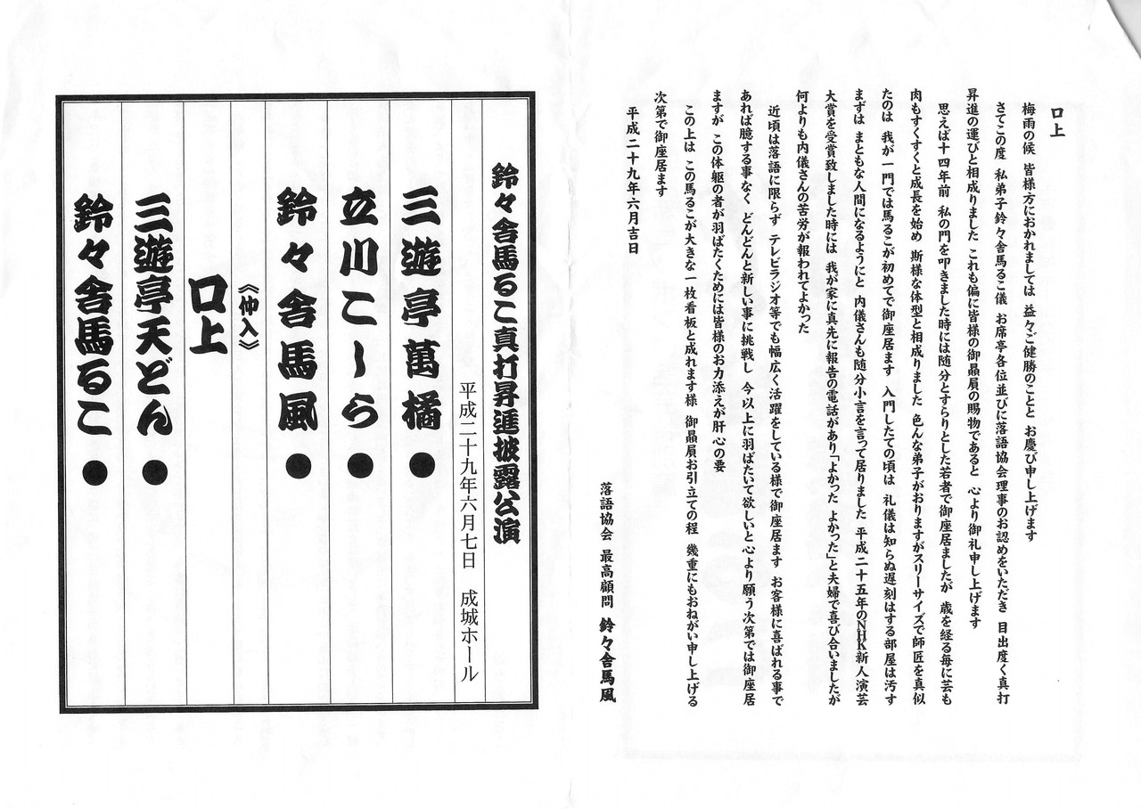 ●天どん(司会)・萬橘・鈴々舎馬るこ・鈴々舎馬風・こしら・広瀬和生 口上
