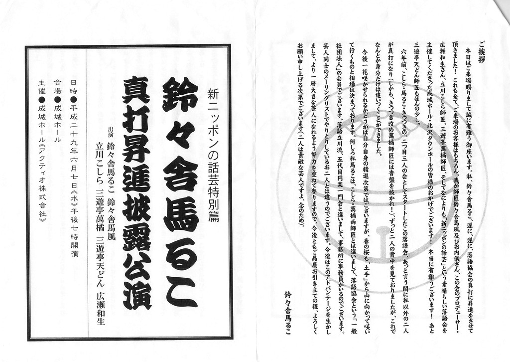 天どん(司会)・萬橘・鈴々舎馬るこ・鈴々舎馬風・こしら・広瀬和生 口上
