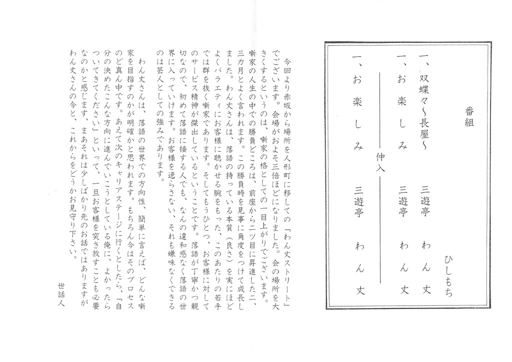 満員ではないけど空席は目立たない、かなりの入りで、やっぱり人気あるわん丈さん。凄いね。