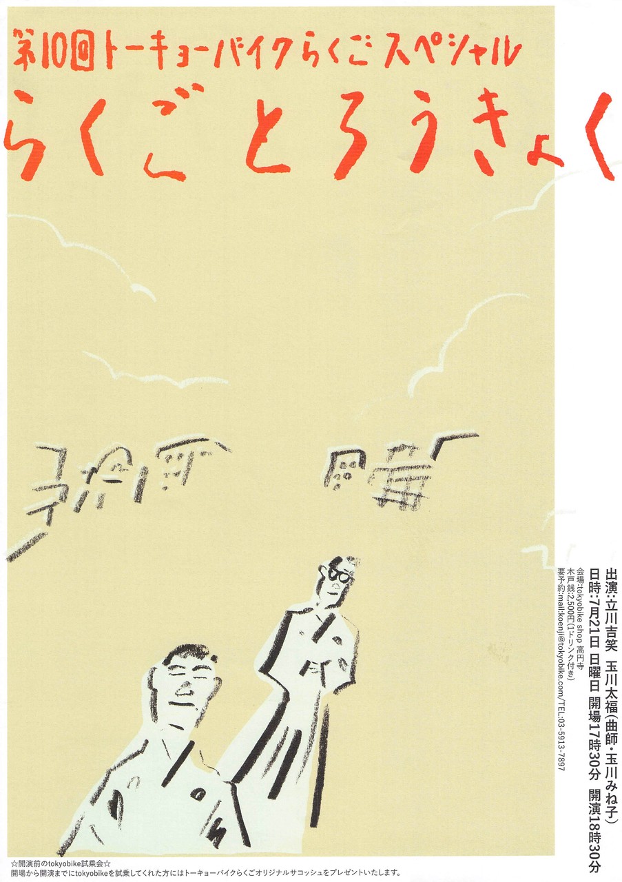 今回は第10回を記念して『トーキョーバイク寄席』ゲストは話芸界きっての自転車好き・玉川太福さん。ふたりともトーキョーバイクのユーザーであります。