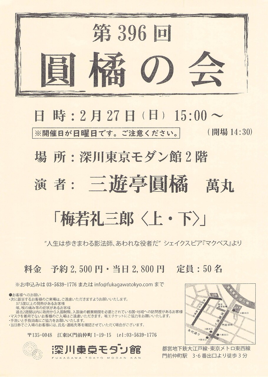 弟子・孫弟子の高座についての愛ある寸評を入れたあと、相撲関連のさまざまなエピソードが楽しい。『稲川』は折りに触れ何度も聴かせて頂いているが、聴くたびちょっと涙ぐむ。弟子に対して、お客様を大切しなさいというメッセージを送りつつ、客にとっては、芸人と客の幸せな関係を提示していただいているような気がする。