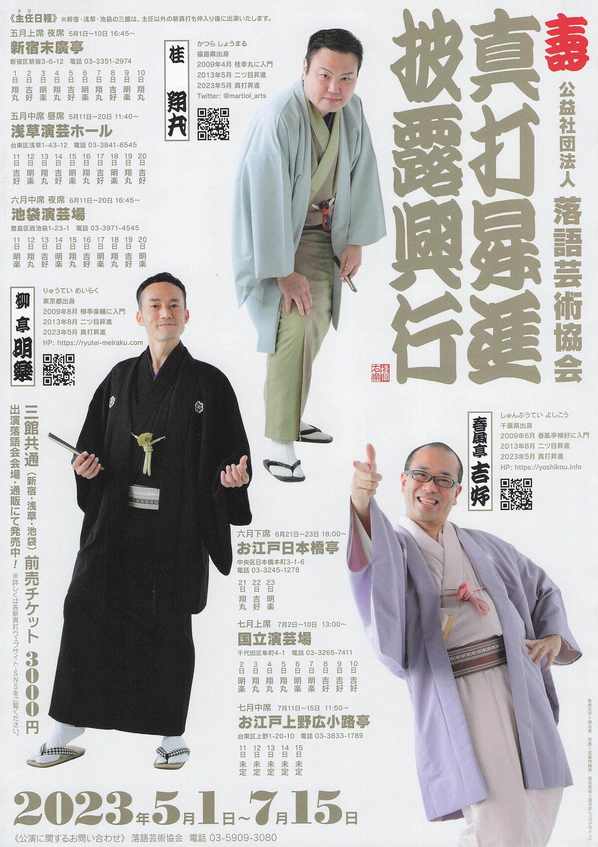 毎週土曜日、落語協会・落語芸術協会それぞれの興行の夜の部のあとに開催していた「深夜寄席」、これに対して五代目円楽一門会と落語立川流の二ツ目もひとりずつ出演する「四派で深夜」は瀧川鯉朝師が立ち上げた。あるとき瀧川鯉八師が担当していたけど事務仕事が苦手て、二ツ目昇進したばかりの吉好さんが継承した(させられた?)。途中から上方も加わって「五派で深夜」として二ヶ月に一回、金曜夜に開催されていた。