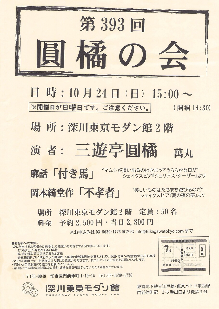 しっかりと抑制が効いた本物の芸でありながら、初心者の耳にも深い喜びをくれる三遊亭圓橘師匠の落語を、ぜひご堪能いただきたい。