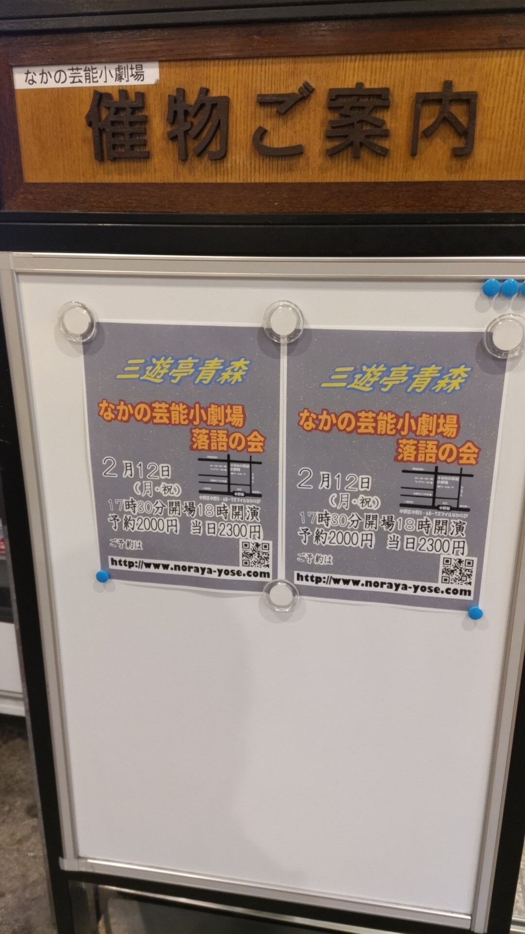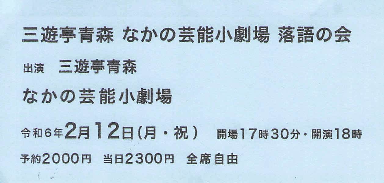 会場 : なかの芸能小劇場 三遊亭青森『手紙無筆USA』 三遊亭青森『悲しみは下北に向けて』 仲入り 三遊亭青森『地獄変』(作;芥川龍之介) 木戸銭2,000円(予約)