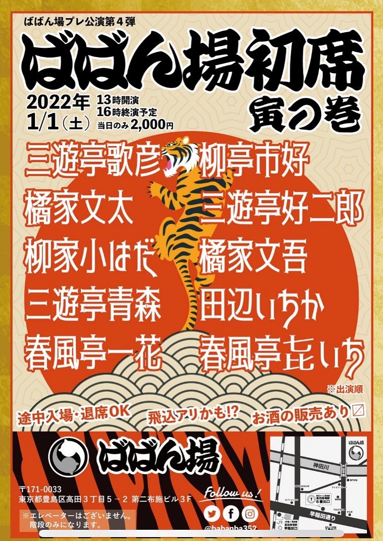 会場 : ばばん場 三遊亭歌彦『新聞記事』橘家文太『雑俳』柳家小はだ『代書屋』三遊亭青森 漫談と歌三遊亭遊かり『幇間腹』仲入りこのあとは(2)春風亭一花『花色木綿』柳亭市好『磯の鮑』三遊亭好二郎『反対俥』柳亭信楽『変身』仲入り橘家文吾『真田小僧』田辺いちか『安政三組盃 間抜けの泥棒』春風亭㐂いち『熊の皮』 木戸銭2,000円